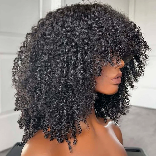 100% premium high-quality human hair bang wig. This 14" unit features a closure hidden by the bang.